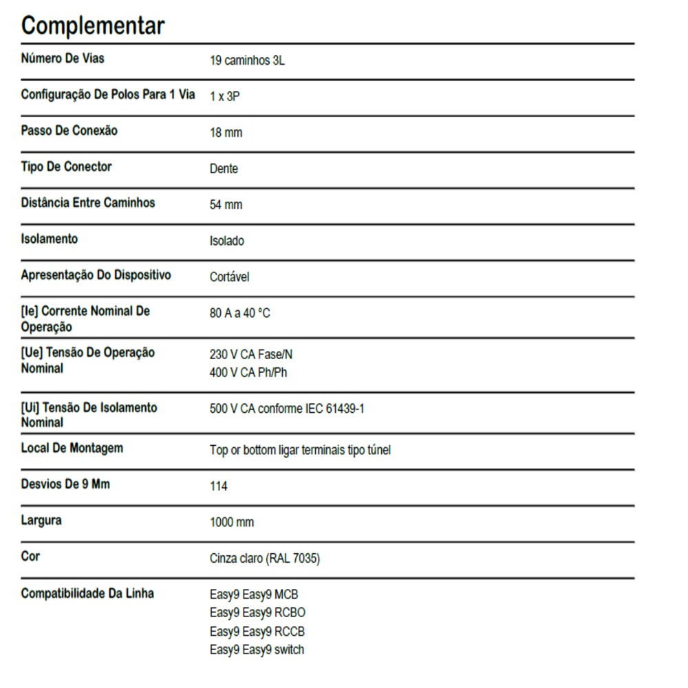 Os barramentos, ou pente de conexão, Easy9 da Schneider Eletric foram desenvolvidos para facilitar a vida do eletricista ao realizar a ligação dos dispositivos de proteção de maneira segura e rápida. Barramento pente tripolar de 57 polos com capacidade de 80A. Este produto está em conformidade com IEC 60947-7-1. Os pente de conexão Easy9 levam o selo Green PremiumTM, que promete conformidade com as mais recentes regulamentações, transparência nos impactos ambientais, produtos circulares e com baixo teor de CO2.